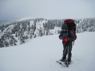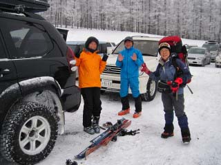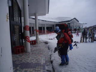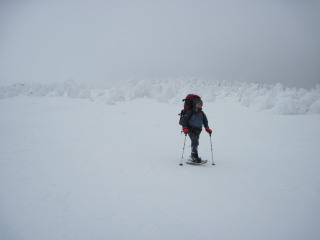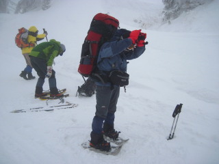 | リフトを下りスノーシューを装着していると、次々に登山者が到着です。こんな天気でもやはり来ますね〜(^^ゞ 気温はマイナス9℃(10時頃)。 |