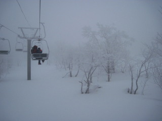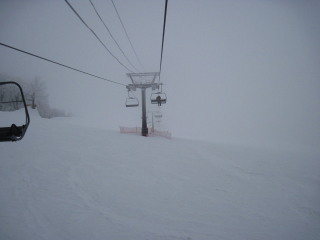 | リフトを下りてもう一つ乗り継ぎますが、乗り場にいくにも周囲はまっしろけ。 | ![]() |