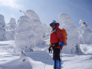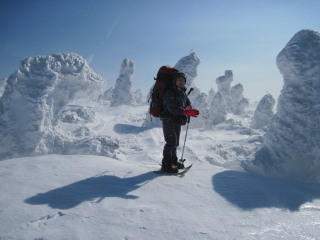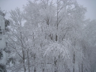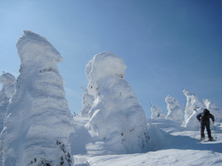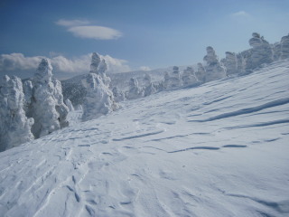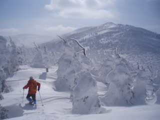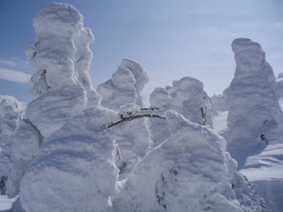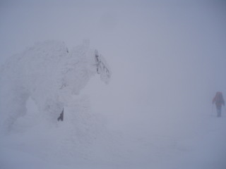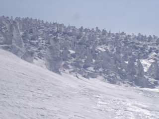 そしてだんだんとモンスターぽい木も。 こんなお天気ですが滑っている人も数名見えました。前が見えなくて怖くないのかな? |