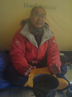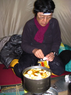 テントを張ってもやはり寒い。さっそく雪を集めて水を作ったりお汁粉を作って食べたりしながら暖をとります。 |