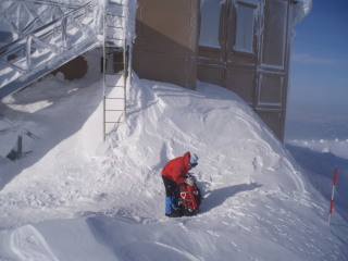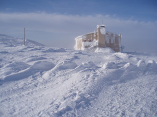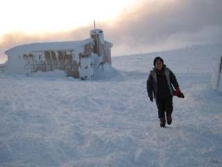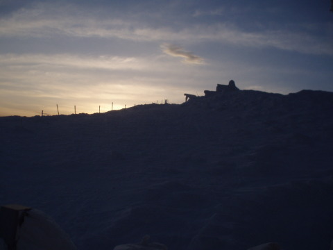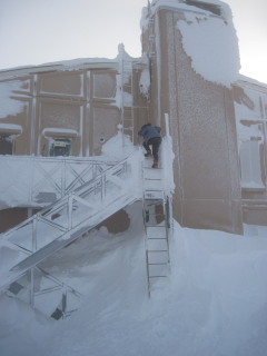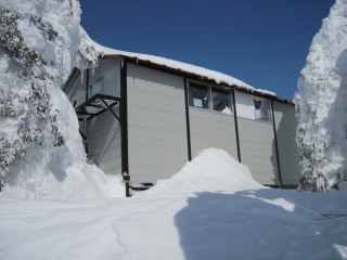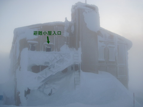 | 登るほどに風が強く、降る雪がビシバシと 顔に当たって痛いほどでした。 そしてGPSのお陰で間違いなくレストハウスへ。 さすがGPS!ありがたや。 (これは夕方写した写真です) ![]() 外の、風を避けた場所で休憩するつもりでしたが 風が強く、場所を捜していると 梯子から人が下りてきました。 お一人はリフトを下りたところで話した地元の男性。 レストハウスの上が避難小屋を併設しており 休憩していたそうで、他にお二人も下りてきました。 少しお話して、それぞれに下山されたようです。 私達もとりあえずザックを下に置いたまま 行動食だけもって避難小屋へ。 |