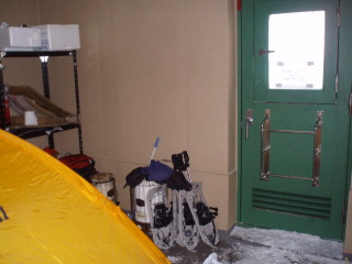 | しばらく外の様子を見ましたが、風がおさまりそうになく、相変わらず何も見えません。 そんなお天気ですから他に来る人もいないようです。ということでここで泊ることにしました。 この部屋の中でさえマイナス10度でビックリ。スノコの上にテントを張りました。高級テント暮らしもとい、高級テント泊。っていうか、これじゃ雪山のテント泊じゃないじゃん^_^; |