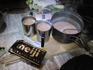 朝は卵雑炊。 そしてチョコを牛乳に溶かしたチョコレートミルク。 元気モリモリ。 |