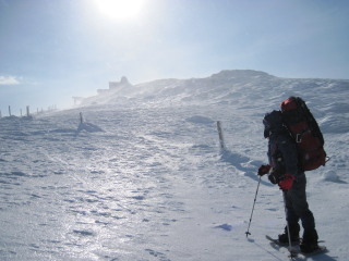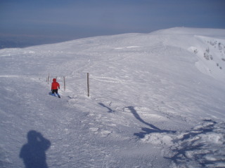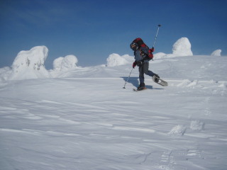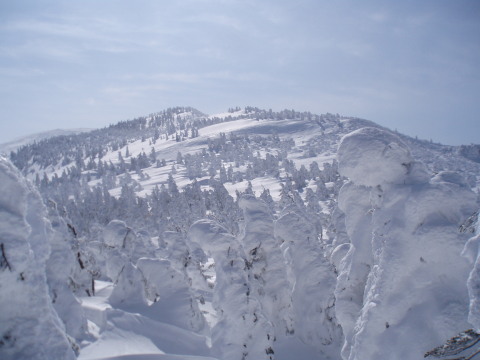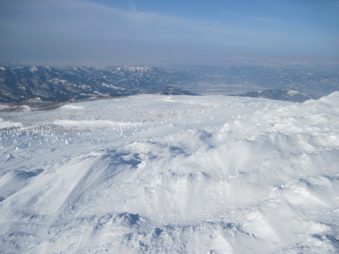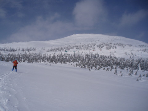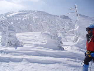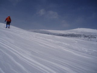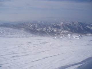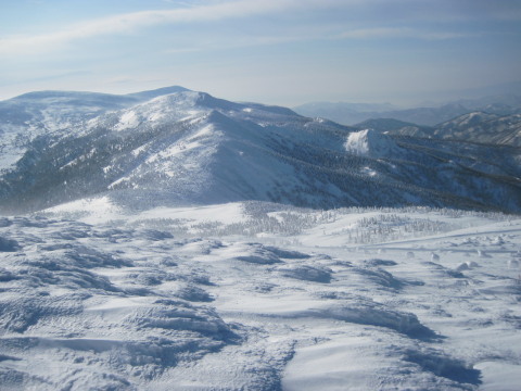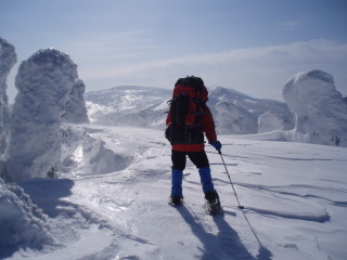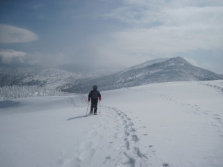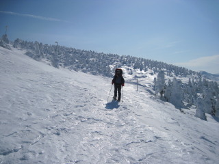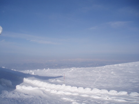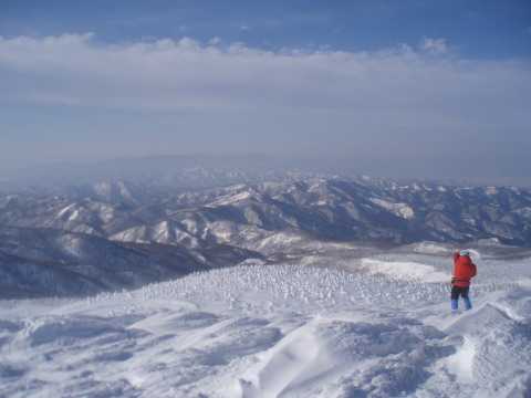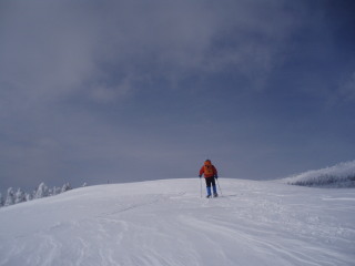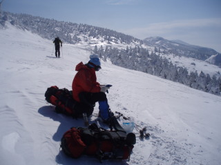 最後の眺めを楽しみつつお茶して一休み。 すると初めて登ってきた人と会いました。これから杉ヶ峰まで行くそうです。テレマークスキーですから帰りは一気に滑り降りてしまうのでしょう。 お天気もまだ持ちそうですし、時間もまだ10時を過ぎたばかり。私達もちょっとだけ行ってみることにします。 |