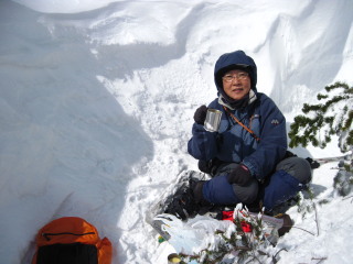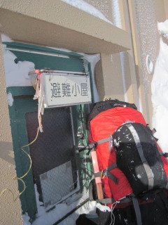 部屋は6畳くらいの広さで鉄筋造りですから床には三分の二ほどスノコが敷いてありました。段ボールが置いてありましたので座布団代わりにして座り、お昼にします。 そしてこの後の相談。外はホワイトアウト状態で風も強い!このまま進むのはGPSをもっていても体力を消耗するだけ。景色も楽しめないのではつまらないですからここで予報の「曇りのち晴れ」を待ってみることしました。 |