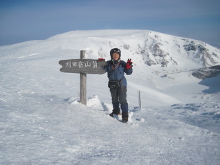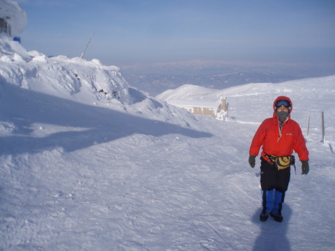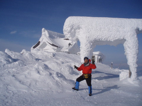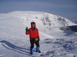 | 熊野岳とお釜をバックに。 風が強くて顔も引き攣ってます^_^; 山頂の気温マイナス6度。 |
