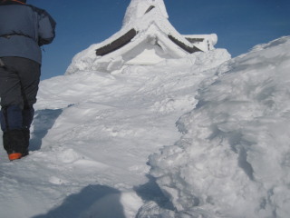 | 山頂の刈田嶺神社。着雪で、より一層重厚なお社と鳥居です。 風もいくらかおさまっていました。 |