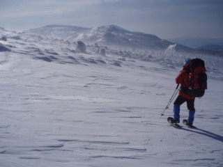 身軽になって歩きだします。でも主な装備はデポしたままですし、晴のち曇りの予報と流れの早い雲が要注意です。 |