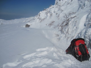 避難小屋の屋根は赤かったのね(^^ゞ 避難小屋の外にはスキーがいっぱい立ててあったので、中で休んでいたようです。ここから先はスキーの人とのすれ違いが多くなりました。 |