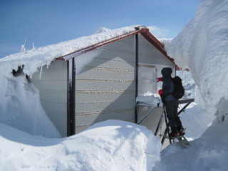 | ちいさな入口から入ると中が暗いと感じ、後から上ってきたトシちゃんにヘッデンを取りに行ってもらいました。でも目が慣れると意外と明るく、灯りは必要ありませんでした。 外には二組のスキー板が立っていましたが、 中はもう私達だけでした。この板長いこと置いてありましたが、5時ごろ外に出た時にはもうありませんでした。この悪天候の中、スキーをはかずにどこへ行っていたのだろう?と謎のまま。 |