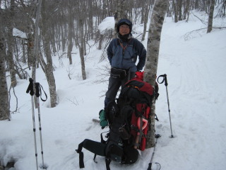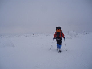 | ザックを担いで歩きはじめる頃には今まで歩いた方向が既に真っ白。気温はマイナス3度。 私達が休憩中に見かけた前山に登っていたスノーシュー?のお二人は大丈夫だろうかと自分たちを棚に上げ心配してしまいました。 |