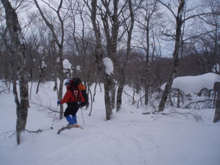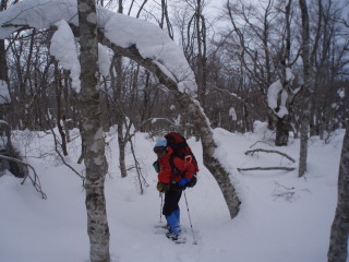 樹林帯の中の雪は新雪ではなく、残雪のような感じでした。 |
