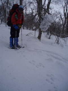 樹林帯に入るとスノーシューの足跡がいっぱいでした。 |