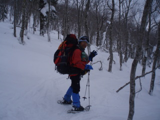 | スノーシューも装着して出発。 | ![]() |