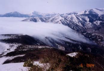 【コ ー ス 】 4日 曇り後みぞれ又は雪 5日 晴後曇り後晴 6日 晴 出発前の情報では20年来の大雪だったため残雪も例年以上だと言う。加えて天気も下り坂。どうしたものか少々迷ったが他に変更するには準備が間に合わない。エスケープルートもいくつかあることだし、ということで予定通り蔵王を目指すことにした。 7日を予備日にして2日午後出発、3ー6日の蔵王縦走。南蔵王、北蔵王、更に北上し神室山、南面白山まで通り抜ける予定だったが、出だしの悪天候で南から北の蔵王縦走に短縮となった。 前日、宮城の白石ICに到着したのは18時頃だったろうか。給油と食事と食糧補給を済ませ、駅の駐車場に車を置く予定を変更して南蔵王キャンプ場へと向かった。温泉に入れる時間には間に合わず残念ながら断念。目的地には20時頃着、今回はゆっくり眠れると気をよくする。が、気になっていた天気予報を聞くとやはり翌日は一日雨と雷だという。そして間もなく雨が降り出してきた。明日は温泉だ〜。 【一日目:3日】 5時頃目覚めると外はどしゃぶりの雨。やっぱり温泉、それともコースを変えようかと考えつつそのまままた眠りにつく。6時に起きると雨がやんでいる。南に吾妻連峰の山並みがきれいに見えた。天気予報が微妙に変わってなんとかもちそうな予感。予定通り行くことにする。駐車場があるわけではなく、キャンプ場の登山口に車を置いて歩き出す。 はじめなだらかな登山道に雪はない。樹林帯の中、気持ちの良い土の上をゆっくり歩いていく。3泊4日の雪山装備はさすがに重い。目指すは不忘山(御前岳)。緩やかな登りに傾斜がつき雪が少し現れたと思ったら再びなだらかな斜面が目の前に広がった。しかし一面の雪。ダケカンバの林はガスに包まれ神秘的だ。流れるガスの合間にときおり不忘山が顔を現すが、ほとんど隠れてしまっている。トレースはおそらく2、3日前の連休につけられたと思われるが昨夜の雨で消えかかっていた。積雪約1メートル、早くも大きい木のまわりの雪はぽっかりとなくなっている。たまにズボッとはまるが全体に雪はしまっていた。 樹林から低木に変わって等高線の間隔が狭くなったと思われるころ、雪は消え、ガレ場になった。距離にして登山口から3キロ地点まで残雪があり、残り1キロは夏道になっている。太平洋側(東側)からのルートはどれも積雪量が多いようだ。踏み後はほとんど見られなかった。こちらにコース変更をしなくて良かった。 山頂についたのは丁度正午。どこからか「エリーゼのために」のオルゴールが聞こえてきた。南西の谷側に部落があるようだった。雨に降られず雷にも遭わず、思いがけなく登れた不忘山山頂。こんな日に登る人は他に誰一人なく、GWにしては静かすぎるがガスの切れ目に近くの山も垣間みることが出来、儲けものの一日に感謝した。 二万五千図の地形図を眺め、不忘山より北の痩せ尾根の雪庇が気になっていたのだが、ここも雪が少なく、心配なく歩けた。ガスは相変わらず広がっていたが、お陰で登山道も比較的分かり易い。しかし南屏風岳に近づくにつれ、ズボッと足がはまるようになってきた。一度はまると膝から腿まで落ちる。ペースが落ち、ワカンを出すが、着けても似たようなものだった。 南屏風岳山頂は広く、雪のないところが広がっていた。岩陰を見つけ少し休憩。再びズボズボ状態の登山道を行く。せめて芝草平まで行きたかったが、ガスも出て見通しもきかないため、3時を目処にビバークすることにした。 【二日目:4日】 夜の内にみぞれから雪にかわって、朝テントの外に出ると新雪が昨日の私達の足跡をうっすら隠し、樹林は見事な樹氷になっていた。相変わらずガスが濃く立ちこめている。その風景がまた美しい。 朝食を済ませ、登山道が分かる安心感から、出発することにする。足を取られながらズボズボ登山道を行くと、前を歩く夫のトーンを下げた心細げな声が振り返った。「これ熊だよ!」、夫の前を見ると、まだ真新しい熊の足跡が横切っている。思わずまわりを見回す。その時の心境たるや一瞬ゾーッとしたが、側にいないと分かると今度はゾクゾクした。しかし首からかけてある笛をこまめに鳴らしながら歩いていった。再び夫が振り返り「トドの足跡もあるよ」と視線を落として言う。すかさず「ゾウアザラシの足跡にしっかりついて行ってるね」(山で、なんで海の動物なんだよぅ)。 水引入道への分岐を過ぎると屏風岳へのルートはだんだんはっきりしなくなってきた。明らかに雪庇と分かる東側にいかないよう樹林の側を歩いて行く。なだらかな樹林帯が広がり、雪のしまっていそうな所を選んで進んでいくと屏風岳山頂に到着。ここも無論ガスで展望がない。 地形図と磁石を頼りに先へ進み、雪面にかすかに残っているスキーの跡を辿って(それも間もなく消える)芝草平方面へと下っていった。下りきったあたりで休憩しガスの晴れるのを待ったが全く晴れる様子がない。まだ昼前だが